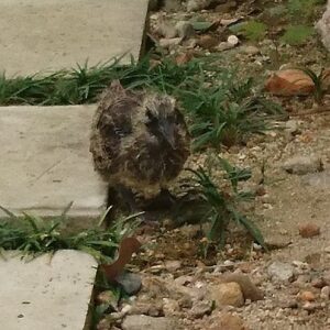 庭をヒョコヒョコ歩いていた、巣立ったばかりのキジバトのヒナ(数年前の写真です)